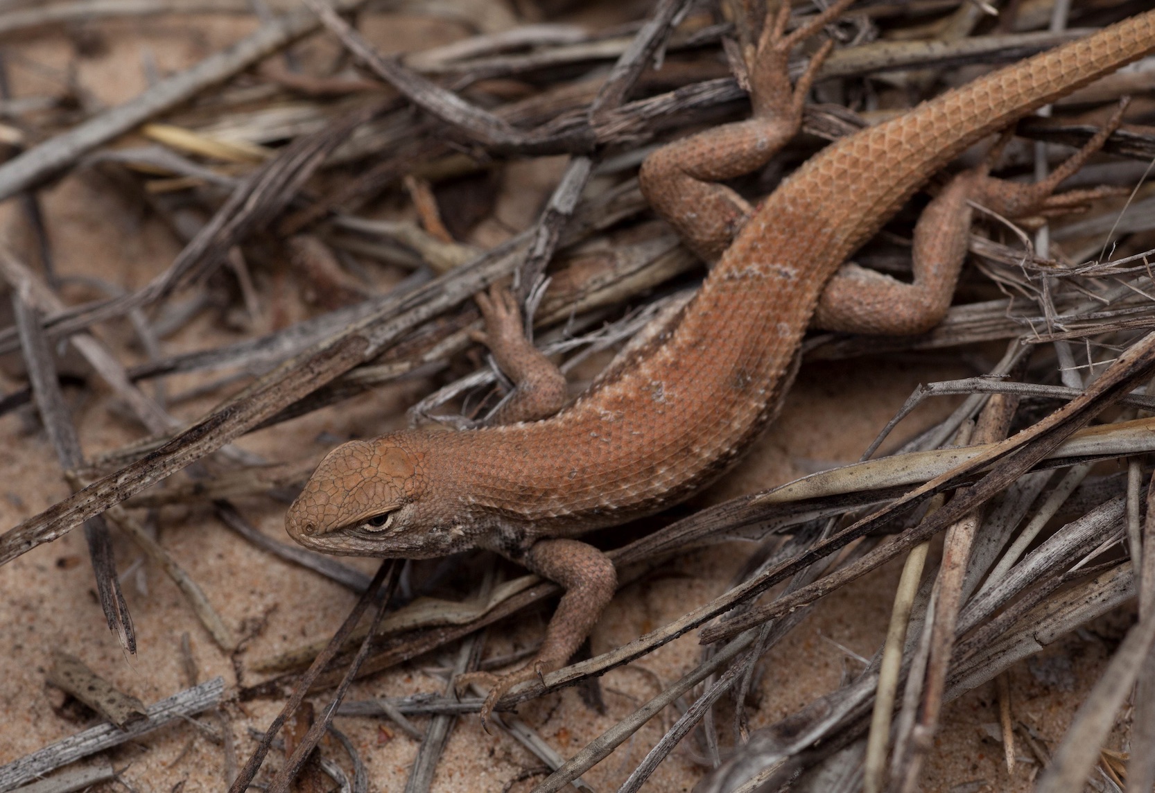 But without the oil rigs or the grazing livestock, the Permian Basin would be quiet, peaceful, and seemingly empty, unless anyone looked beneath the shinnery oak. Under the shrubbery’s protection, Dunes Sagebrush Lizards scurry over the sand, looking for the best places to burrow. They are a fastidious homemaker, inspecting even the size of the sand grains before claiming a place amongst the oak’s root system. When not in the burrows, the lizards reside inside the blowouts, bowl-shaped depressions found under the shinnery oak, hunting for any insect it can find during the day and seeking refuge from any nocturnal predators once evening falls.